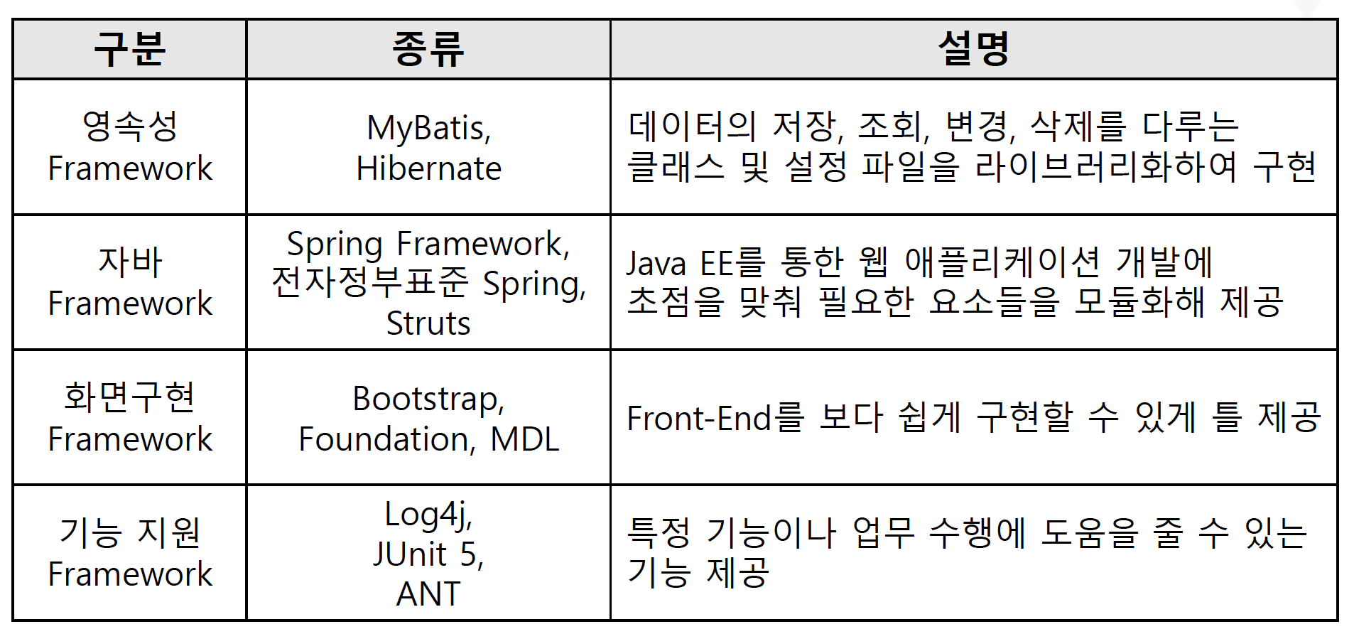- 개발자가 보다 편리한 환경에서 개발할 수 있도록 제공하는 뼈대/틀 -> 소프트웨어 개발의 입장에서는 공통으로 사용하는 library/개발도구/interface 등을 의미