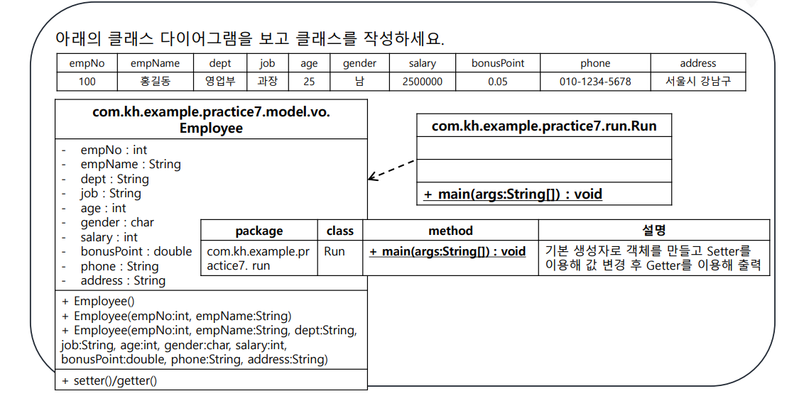 - 목적/기능 → 객체 생성 시, 기본 생성자 사용해서 객체 생성 후 setter를 이용해서 필드값 초기화, 또는 객체 생성과 동시에 필드값을 초기화