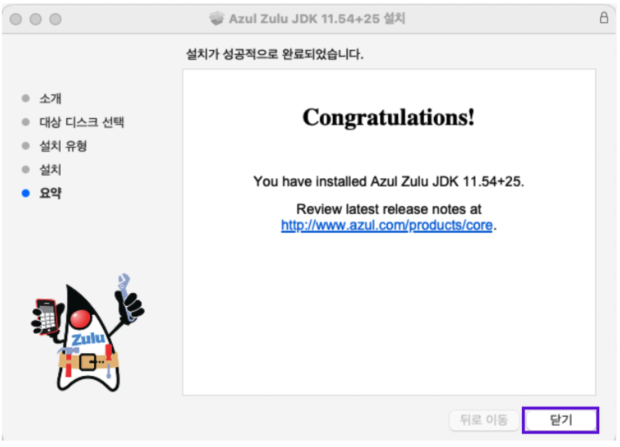 - 설치가 완료되면 아래와 같은 창이 나타납니다. '닫기' 버튼을 눌러 설치 창을 종료합니다.