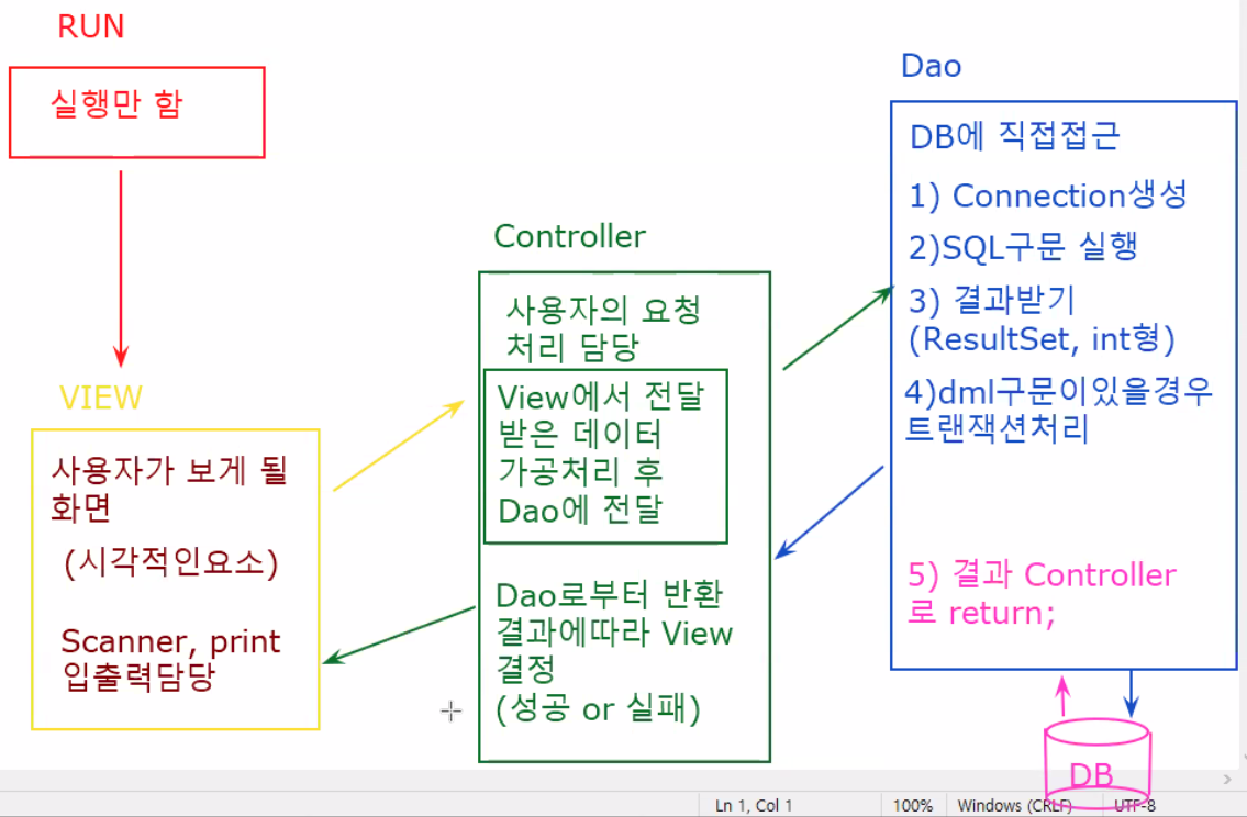 - DAO(Database Access Object) = DBMS에 접속하여 실제 데이터를 전송하거나 결과 값을 전달받는 클래스가 있는 패키지