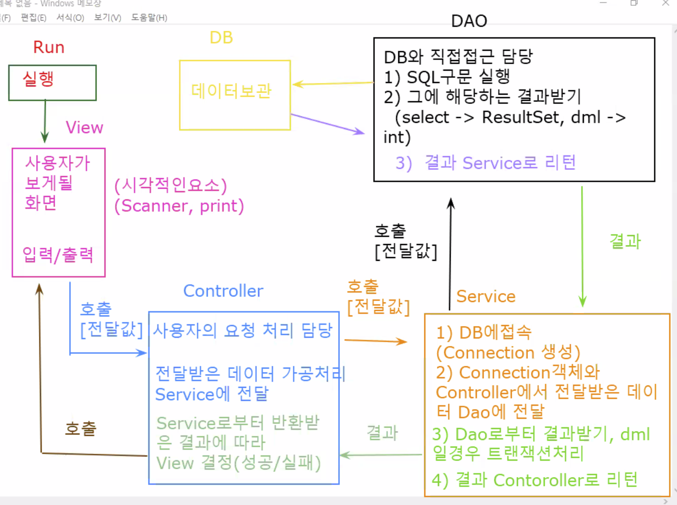 - Controller와 Dao 사이의 역할 = Controller에서 Service 호출(Connection 객체 생성) 후, Service를 거쳐서 Dao로 넘어감