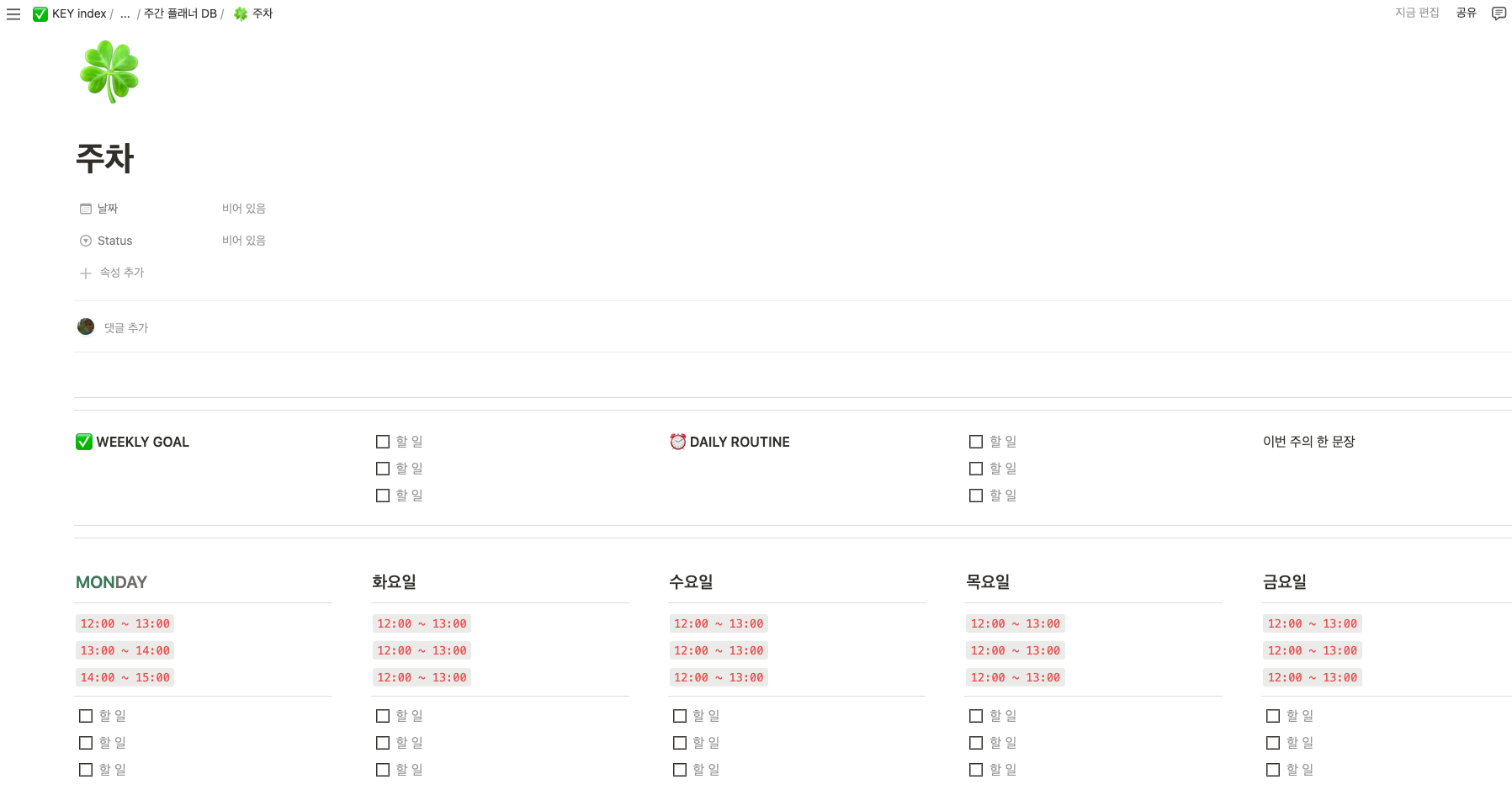 e.g. 주간 플래너 양식 = weekly goal + daily routine + daily 일정 + daily to-do list 등 포함