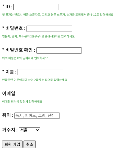 <input type="submit" value="회원 가입" onclick="return validate();"> <!--'회원 가입' 버튼을 누르는 순간 함수 호출해서 유효성 검사 실행; false일 경우 못 넘어가게 하기 위해 return 기재-->
